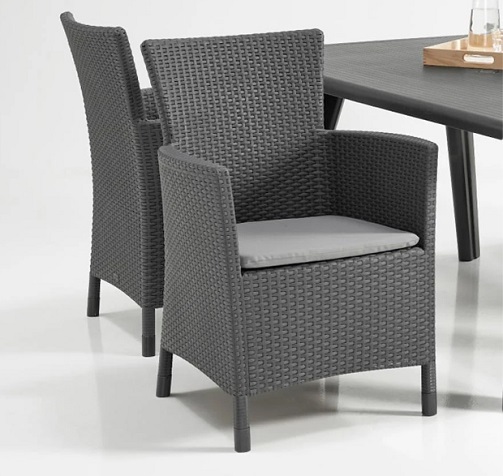 Iowa je elegantna i udobna vrtna fotelja s jastukom. Širok raspon boja i originalna površina nalik na ratan zadovoljit će i najzahtjevnije korisnike. Izrađena je od plastike otporne na UV zračenje i vremenske uvjete. Jednostavna za čišćenje i vrlo jednostavna za sastavljanje.