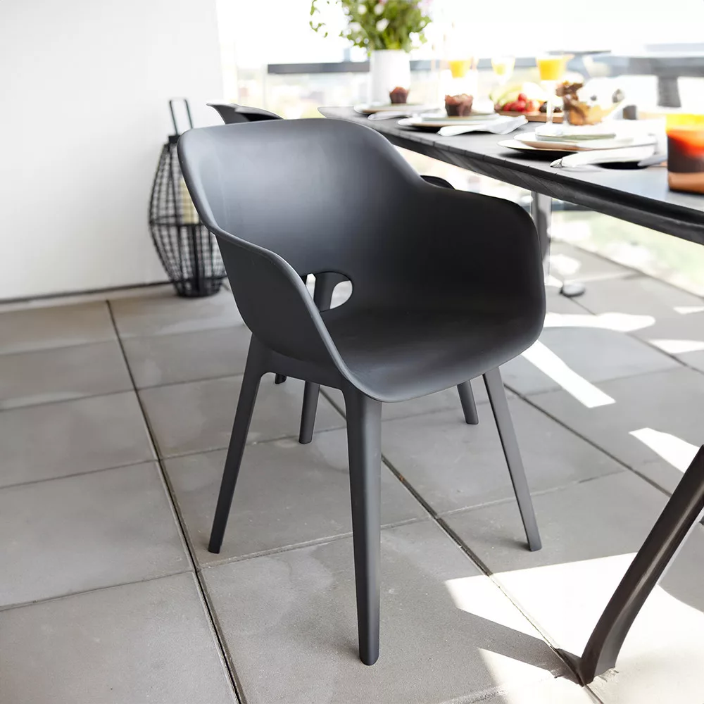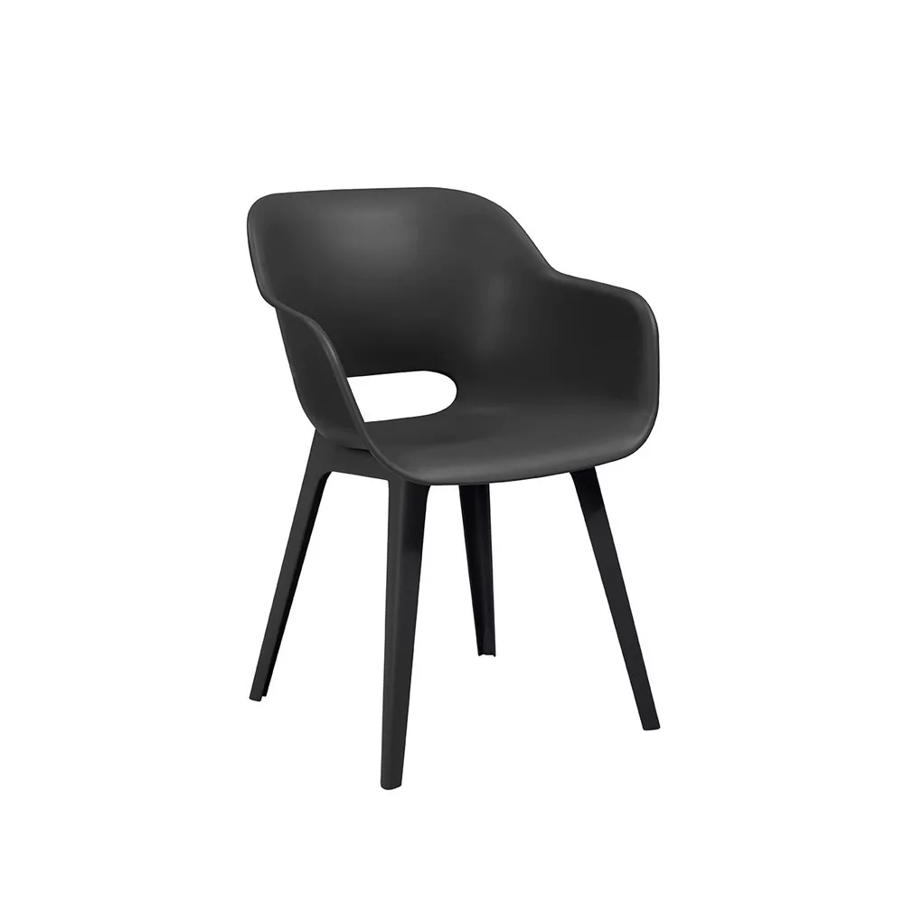 Vrtna stolica Akola Duo u grafitnoj boji ima jedinstven oblik s zaobljenim naslonom i naslonima za ruke.