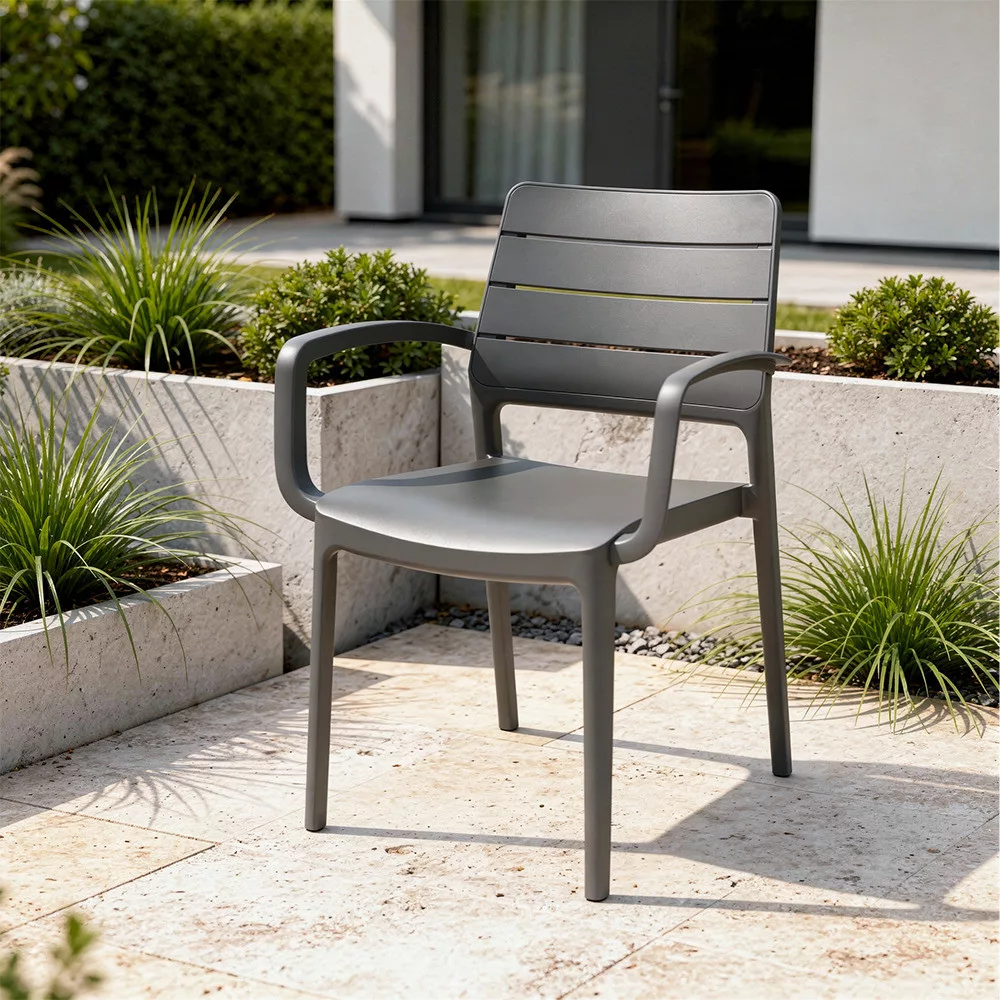 Sa svojim čistim linijama i ergonomskim dizajnom, vrtna stolica Porto s naslonima za ruke pruža udobno sjedenje za svakodnevnu upotrebu. Nasloni za ruke pružaju stabilnu potporu vašim rukama, osiguravajući udobnost čak i tijekom dulje upotrebe.