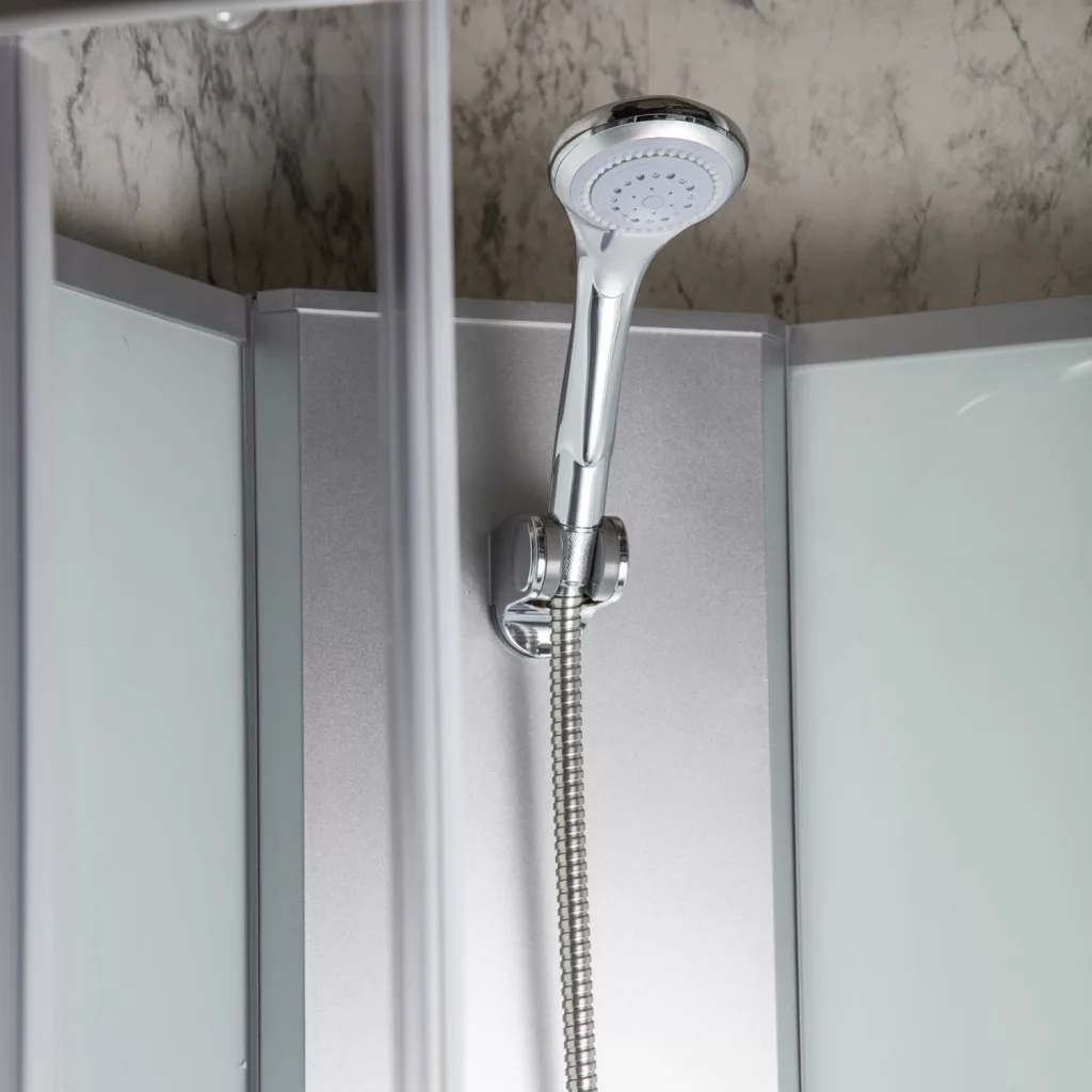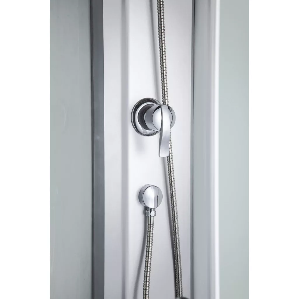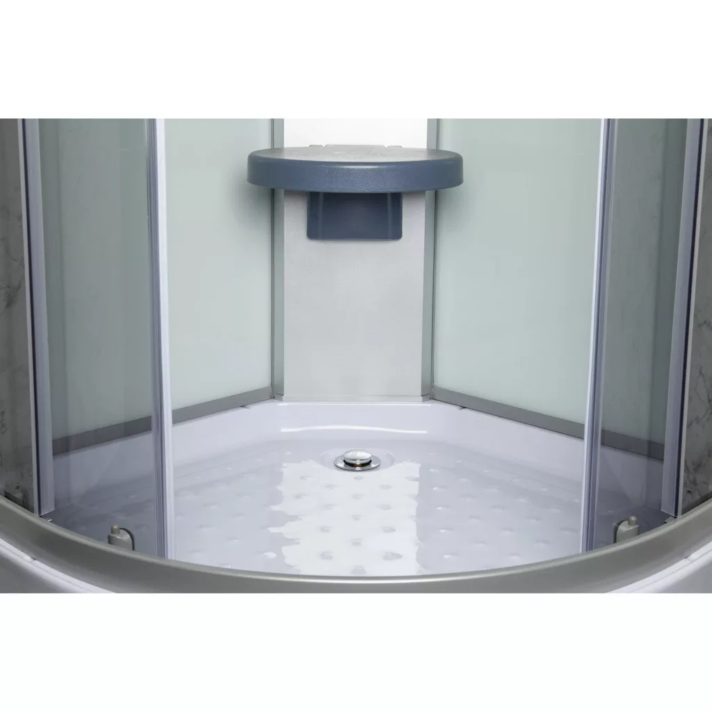 Kabina je opremljena sklopivim sjedištem, slavinom i tuš glavom.