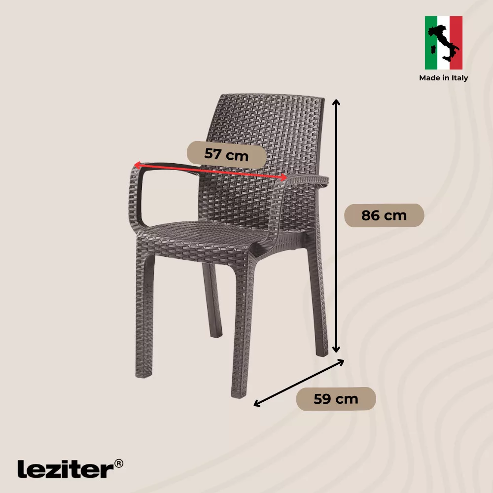 Bilo da imate mali balkon ili prostrano dvorište, dimenzije vrtne stolice Verdi (57 x 59 x 86 cm) nude savršenu ravnotežu između kompaktne veličine i prostranog sjedišta. Nasloni za ruke pružaju dodatnu udobnost, tako da se možete satima opuštati uz dobru knjigu ili u razgovoru s prijateljima. Izdržljiv, vremenski otporan materijal s izgledom ratana znači da može ostati vani na terasi tijekom cijele godine. Nema više blijedanja ili pucanja – samo čista, bezvremenska elegancija!