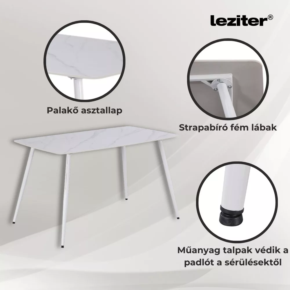 Kvadratni stol za blagovanje Leziter Bora 140 cm ima ploču od sinteriranog kamena, materijala otpornog na ogrebotine, mrlje i toplinu. Plato je izrađen od prirodne gline i pijeska, prešan pod pritiskom većim od 10.000 tona i zatim pečen na temperaturi višoj od 1200 °C, što rezultira iznimno izdržljivom, elegantnom i lako čistivom površinom. Bijelo obojene metalne noge jamče čvrstu potporu, dok plastične podloge štite pod od ogrebotina. Bit će pravi središnji komad u vašoj blagovaonici na koji ćete uvijek moći biti ponosni.