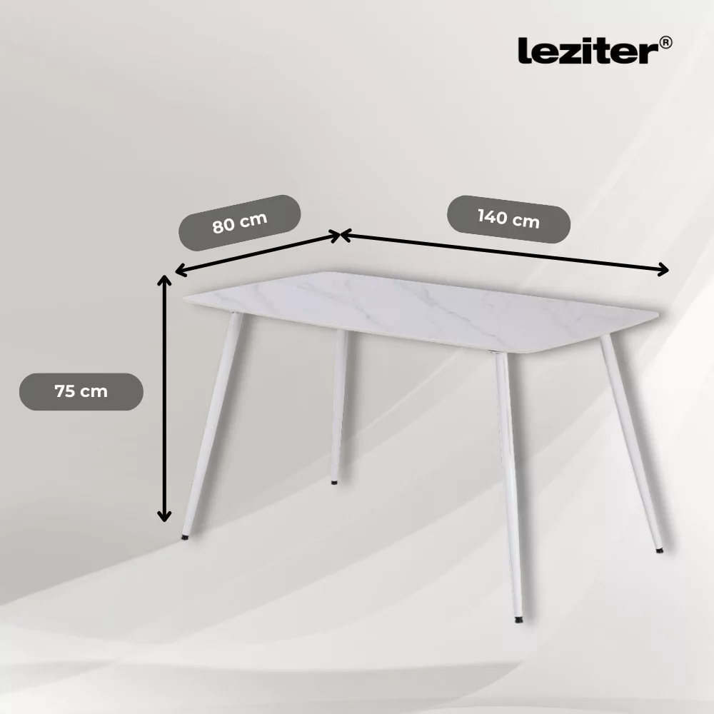 Svojom bijelom bojom i čistim, modernim dizajnom, blagovaonski stol Leziter Bora stvara profinjenu atmosferu u svakoj prostoriji. Njegova veličina (140x80x75 cm) čini ga idealnim za srednje velike i veće prostore, pružajući udobno sjedenje za do 4-6 osoba. Ploča stola izrađena je od sinteriranog kamena, koji je iznimno otporan na ogrebotine, mrlje i toplinu zahvaljujući svojoj prirodnoj teksturi i vrhunskoj proizvodnoj tehnologiji. Bijelo obojene metalne noge pružaju dodatnu stabilnost, dok plastične podnožice štite pod. Raspakirani dizajn omogućuje brzo i jednostavno sastavljanje, tako da možete brzo uživati u eleganciji i udobnosti svoje nove blagovaonice.