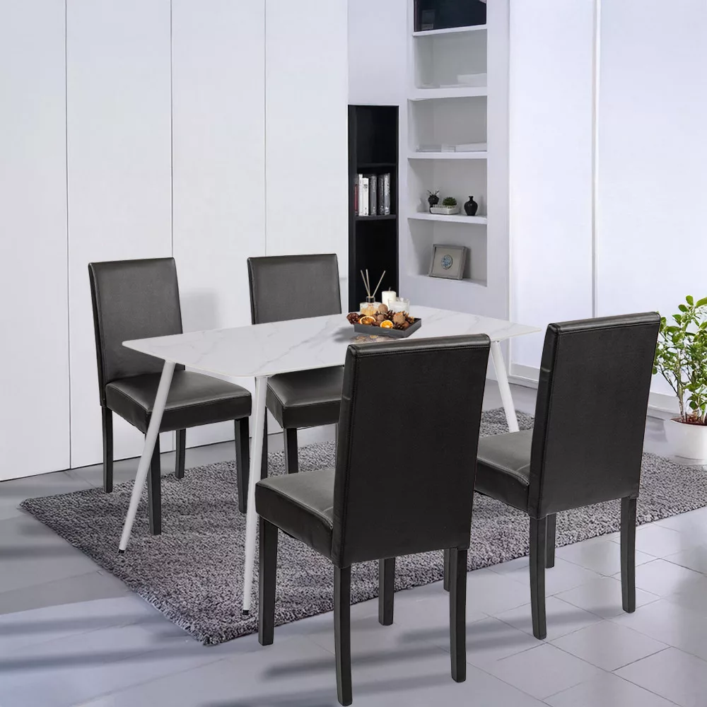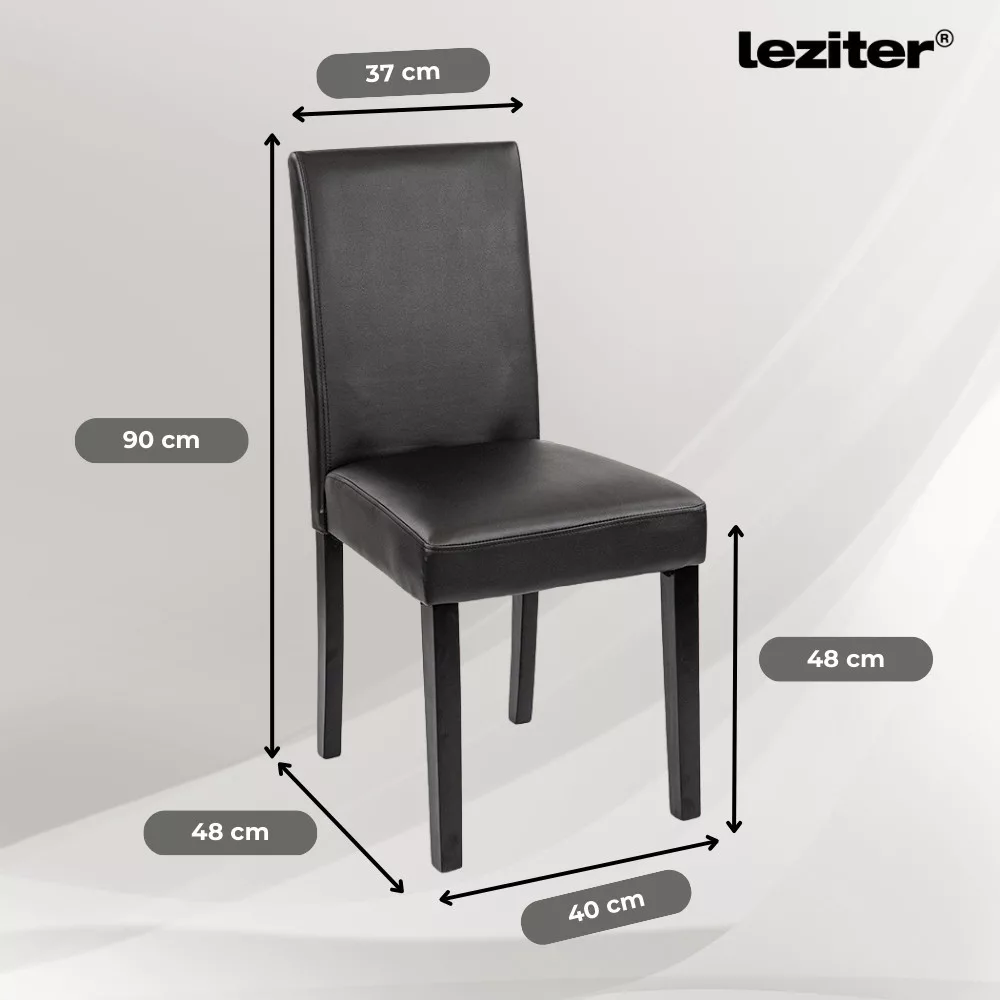 Set uključuje četiri stolice Leziter Kelly, koje nisu samo elegantne, već i iznimno jednostavne za čišćenje zahvaljujući presvlaci od crne ekokože. Debela pjenasta sjedalica debljine 4 cm osigurava udobnost čak i tijekom duge večere, a stabilne noge od borovine, s nosivošću do 120 kg, ostaju pouzdane i pri intenzivnoj upotrebi.