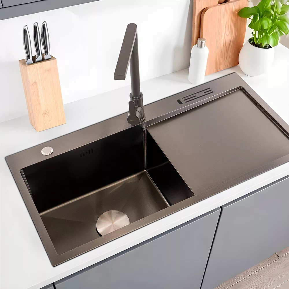 Nano-tehnološki premaz od nehrđajućeg čelika ne pruža samo estetske prednosti, već i štiti sudoper od masnih mrlja i prljavštine. Precizna izrada i materijal debljine 3+0,8 mm osiguravaju maksimalnu otpornost tijekom svakodnevne upotrebe.