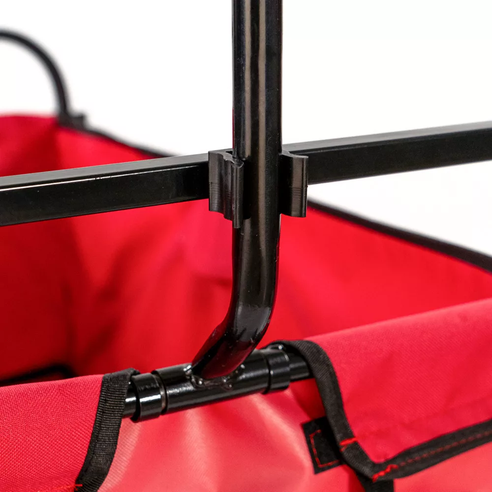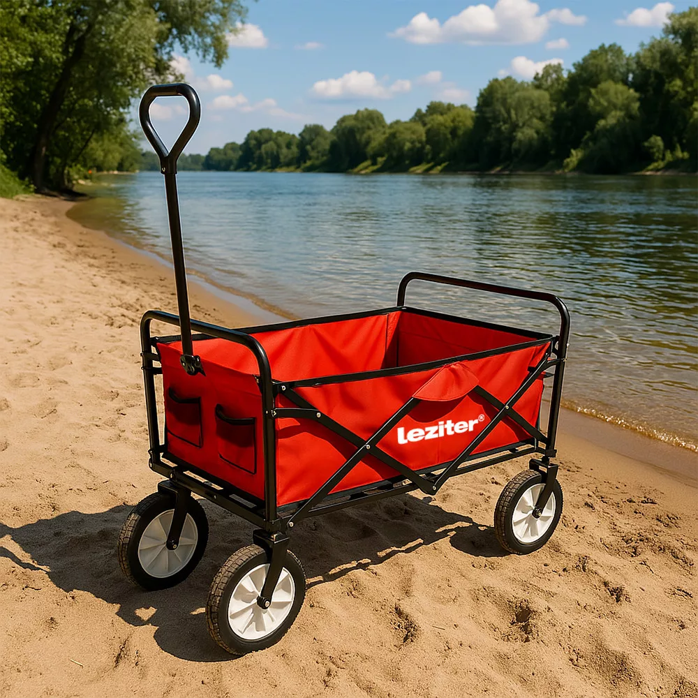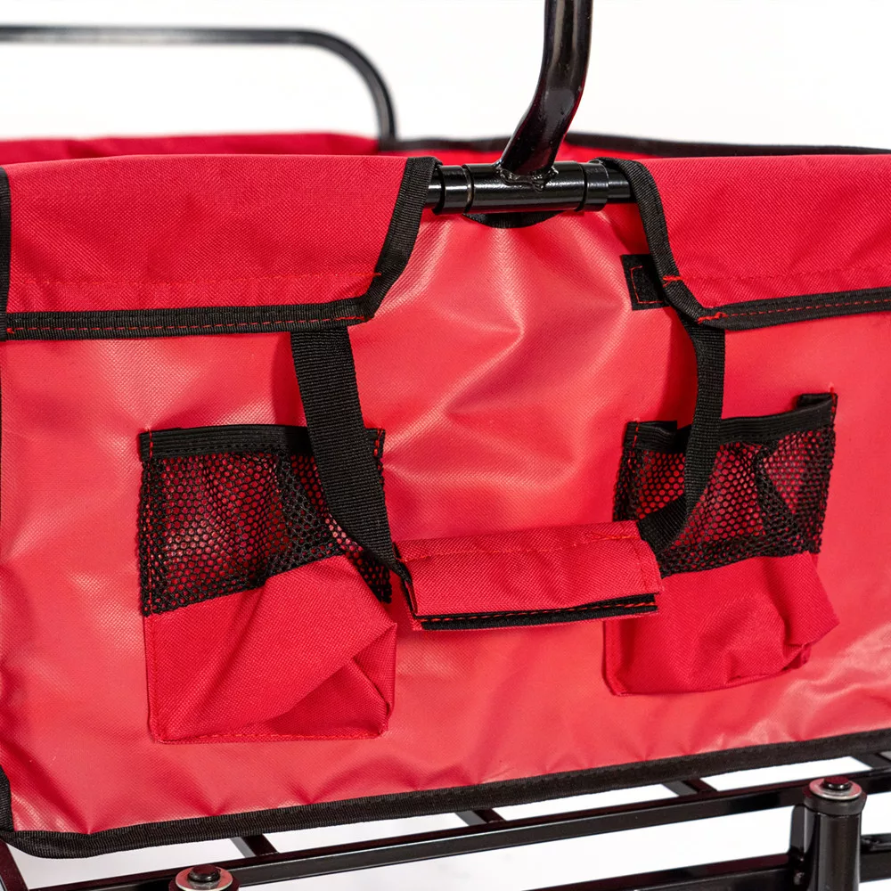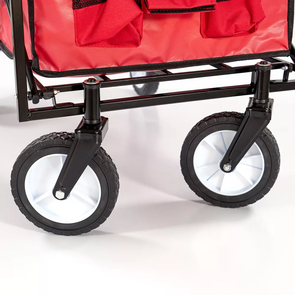 Materijal: Plažna kolica imaju čelični okvir koji je iznimno stabilan i izdržljiv. Košara je izrađena od poliesterske tkanine 600D, koja nije samo čvrsta i izdržljiva, već i laka za čišćenje. Jarko crvena boja daje kolicima upečatljiv izgled.