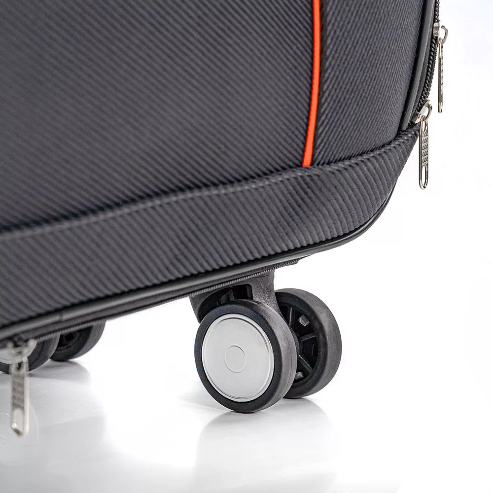 Četiri dvostruka kotačića osiguravaju tiho i glatko kretanje u bilo kojem smjeru. Zahvaljujući izvrsnoj upravljivosti, možete se udobno kretati kroz uske prostore ili prometne zračne luke.