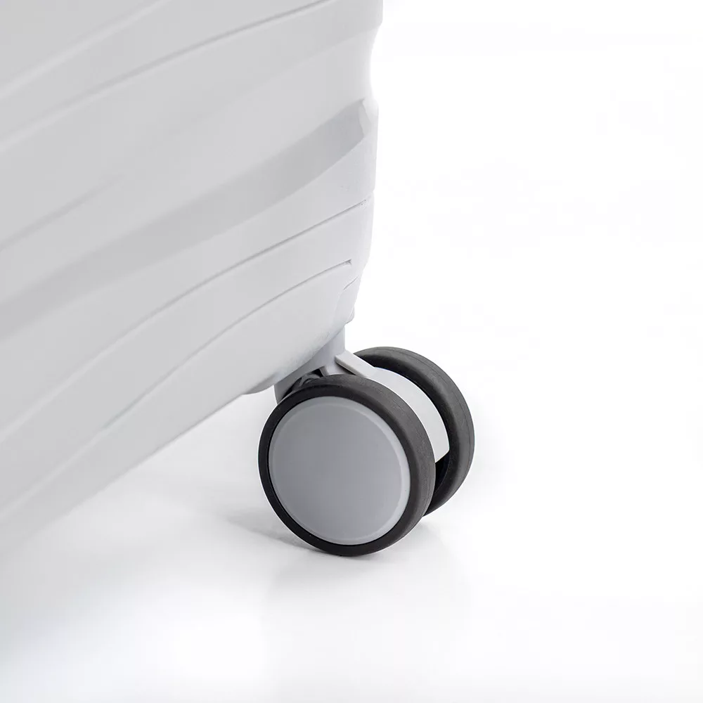 Četiri dvostruka gumena kotačića osiguravaju tiho i glatko kretanje u bilo kojem smjeru. Izvrsna upravljivost omogućuje vam udobno kretanje u skučenim prostorima ili pretrpanim zračnim lukama, čime vam putovanje postaje lakše.