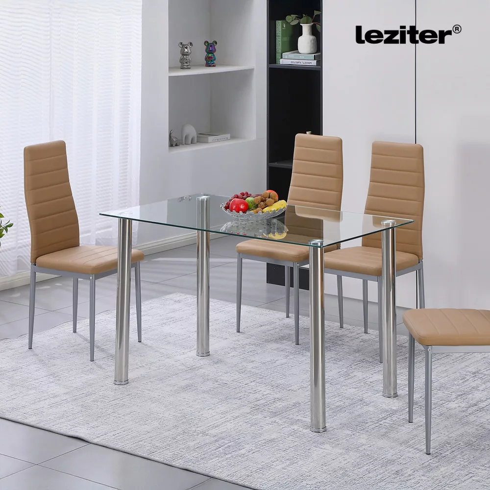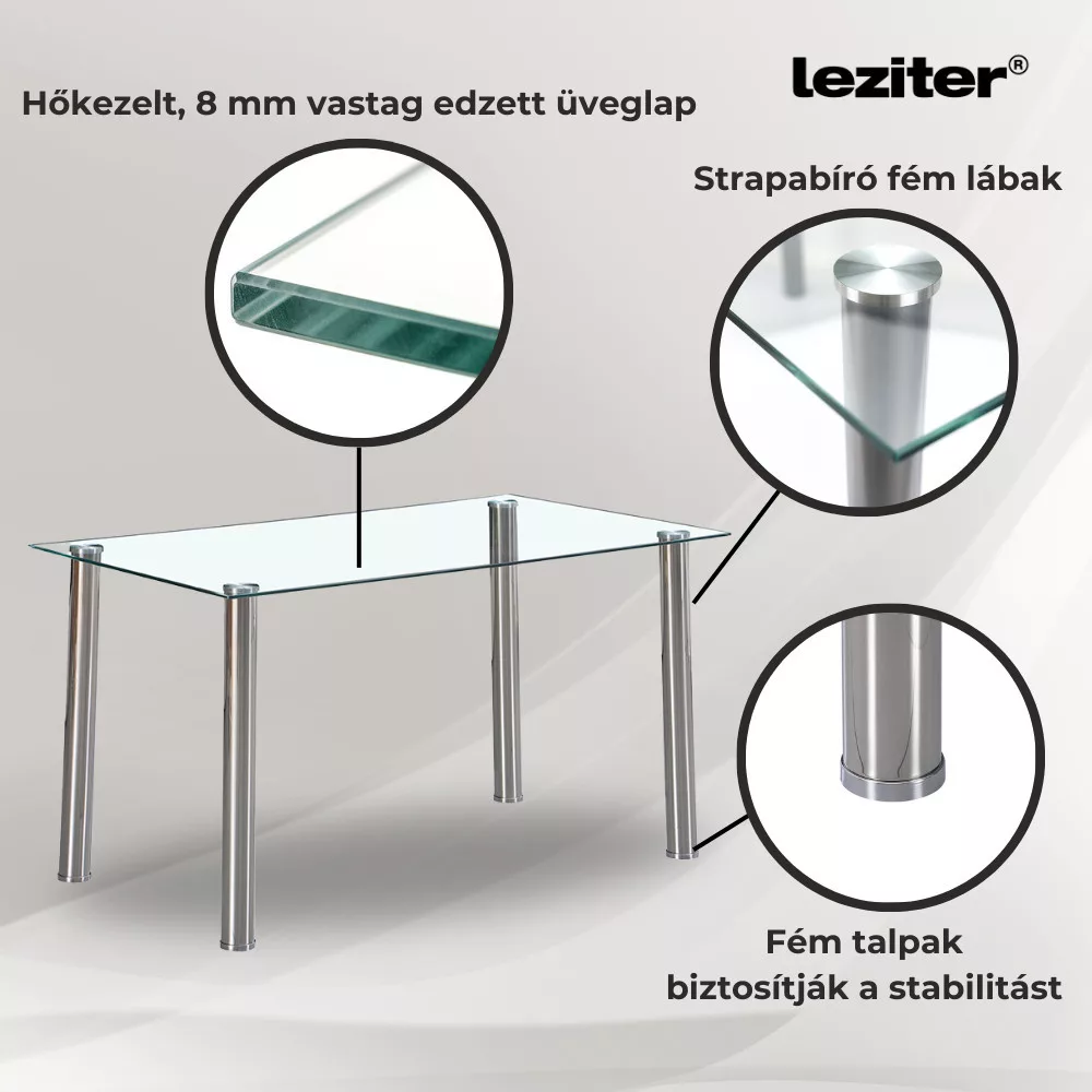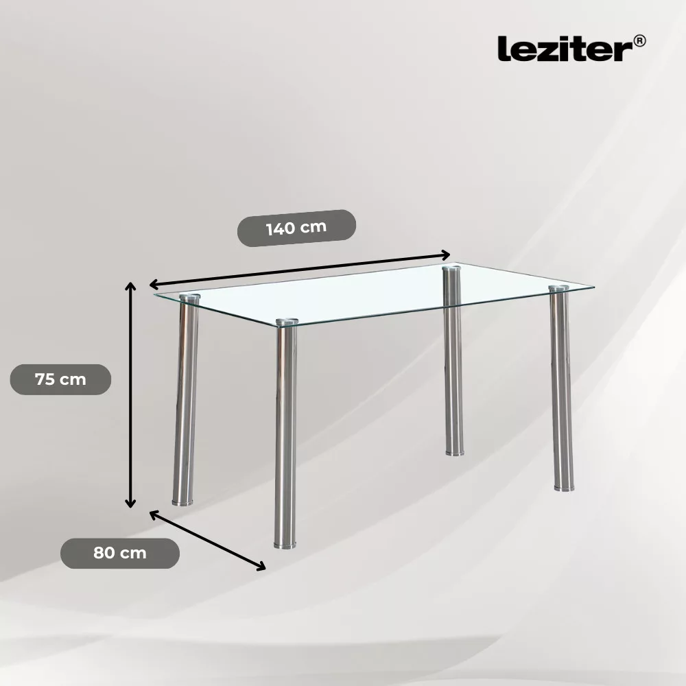 Berna 140 cm kvadratni stakleni stol za blagovanjeElegantan, s čistim linijama i izdržljiv – vrijeme je da svoju blagovaonicu podignete na višu razinu!Mnogi blagovaonski stolovi s vremenom postaju nestabilni ili se teško uklapaju u moderne interijere. Sa svojim čistim, minimalističkim dizajnom i čvrstim metalnim nogama, stakleni blagovaonski stol Leziter Berna 140 cm osigurava dugoročnu stabilnost i eleganciju.Izdajno i sigurno kaljeno stakloStaklena ploča stola izrađena je od 8 mm debelog kaljenog stakla, otpornog na manje udarce i ogrebotine. Zahvaljujući postupku toplinske obrade, pruža veću sigurnost i dulji vijek trajanja od tradicionalnih staklenih površina.Čvrste metalne noge i zaštita podaNoge od nehrđajućeg čelika nisu samo izdržljive, već stolu daju i elegantan izgled. Plastične podloške na dnu štite pod od ogrebotina i habanja, pa se stol može koristiti na bilo kojoj vrsti podne obloge.Idealna veličina i čist dizajnS dimenzijama 140 cm duljine, 80 cm širine i 75 cm visine, pruža dovoljno prostora za 4-6 osoba, što ga čini savršenim izborom za obiteljske večere ili druženja s prijateljima. Njegov moderan izgled znači da se uklapa u svaki stil uređenja interijera.Stakleni stol za blagovanje Leziter Berna spaja estetiku i funkcionalnost, dok njegova čvrsta konstrukcija osigurava da će biti pouzdan suputnik u vašem domu dugi niz godina.