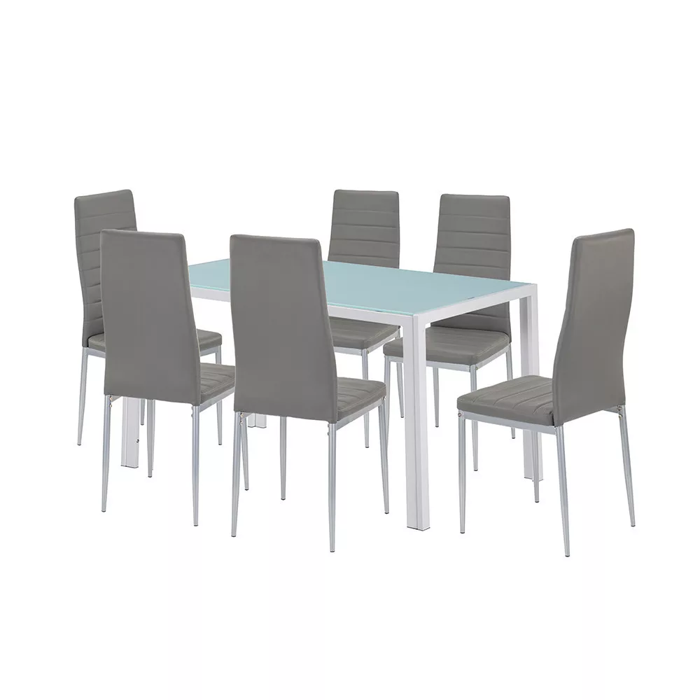 Mabel 6+1 blagovaonski set – moderan stil s sivim stolicama i stolićem od kaljenog stakla