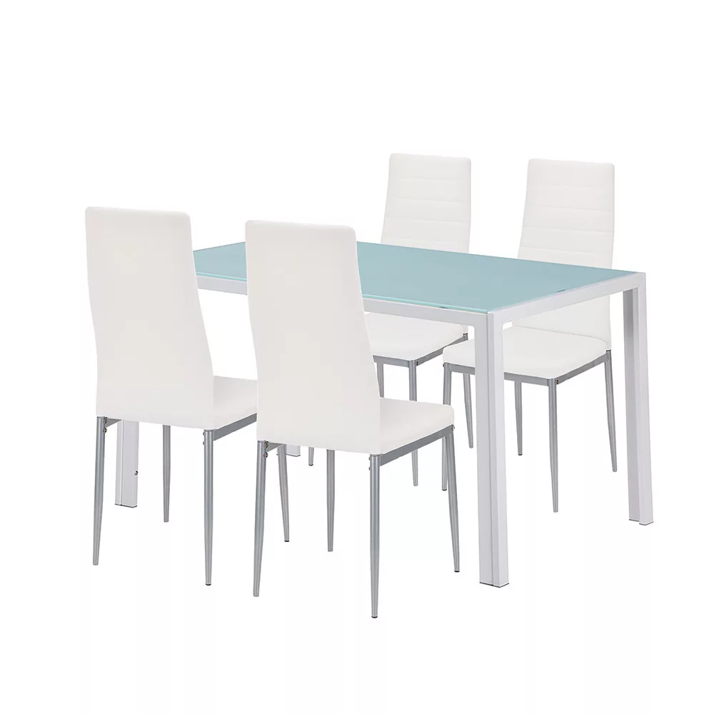 Blagovaonski set Mabel 4+1idealanje izbor ako želite spojiti stil, udobnost i praktičnost. Stol čistih linija izrađen je sgornjom plohom od kaljenog, toplinski obrađenog stakla otpornog na udarceibijelim metalnim nogama s praškastim premazom – kombinacija koja uljepšava prostor i osigurava stabilnost za svakodnevnu upotrebu. Zahvaljujući dimenzijama od 140 × 80 cm, stol je idealan za manje kuhinje i blagovaonice, a istovremeno pruža udoban prostor za objedovanjeza4–6 osoba.