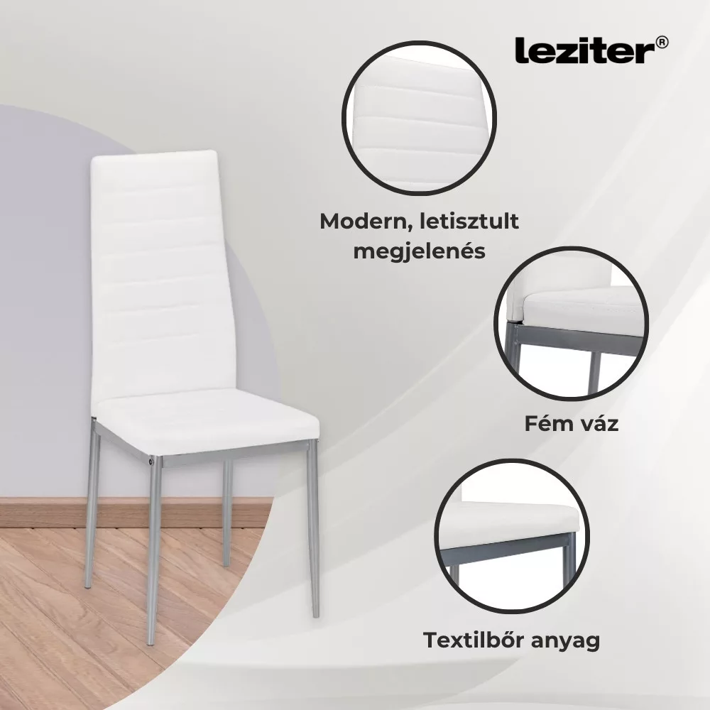 - Materijal stolice: bijeli tekstil, kožni sjedalo, sive željezne noge