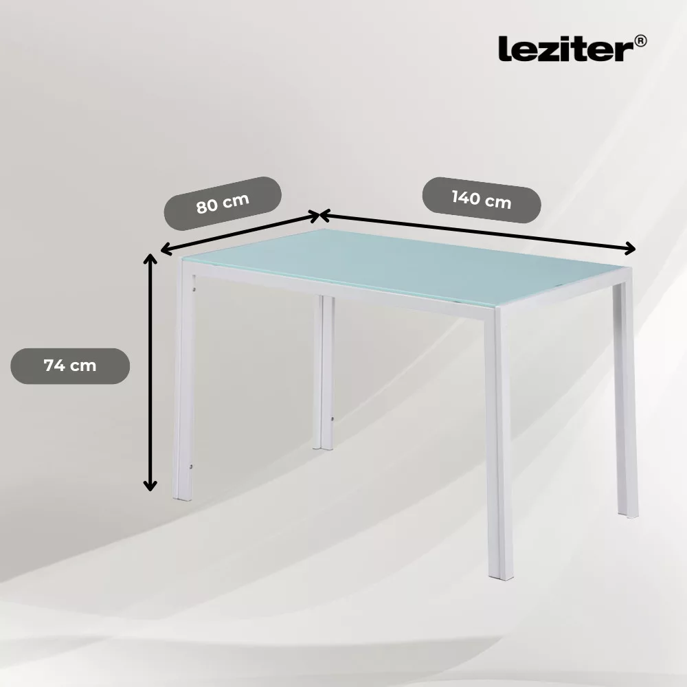 Stakleni blagovaonski stol Leziter Ezra središnji je komad Mira seta. Njegova bijelo obojena staklena ploča čini prostor svjetlijim i prostranijim, dok čist dizajn stvara svježu, elegantnu atmosferu u svakoj prostoriji. S dimenzijama 140x80x74 cm, idealan je za male do srednje velike prostore te pruža udoban prostor za blagovanje za 4-6 osoba. Termički obrađeno kaljeno staklo debljine 8 mm otporno je na ogrebotine, toplinu i mehanička oštećenja, dok metalne noge dimenzija 20x40 mm s prevlakom otpornom na koroziju osiguravaju dugoročnu stabilnost i izdržljivost.