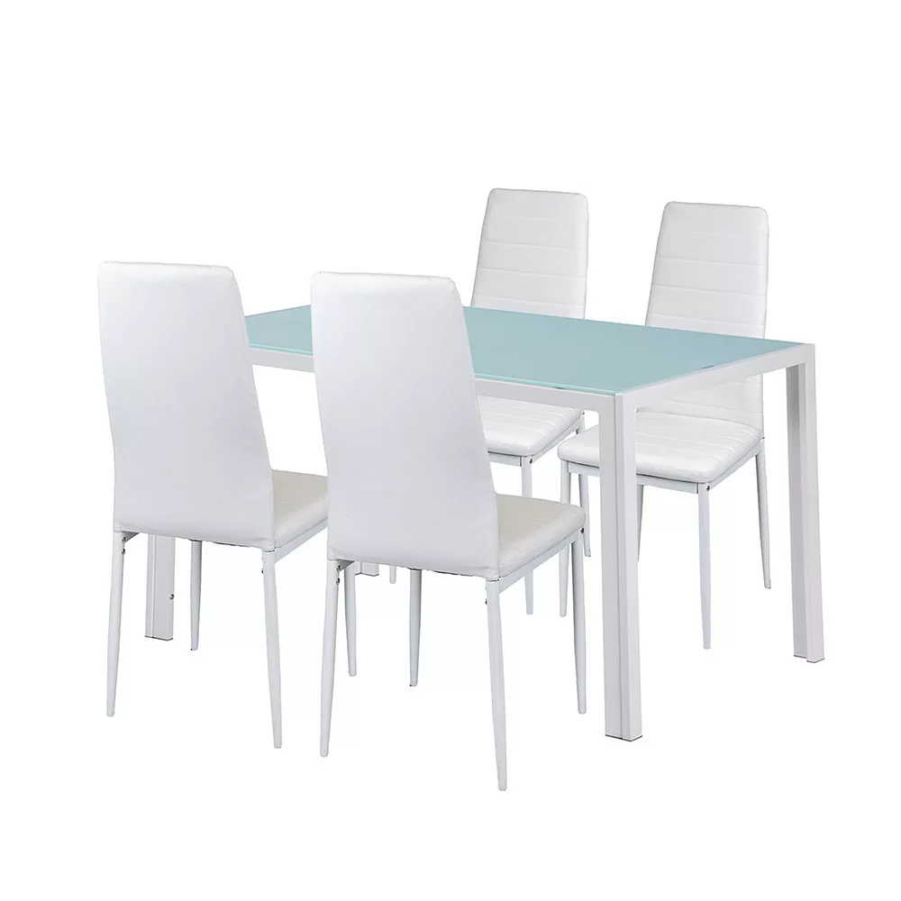 Staklene površine daju prostoru dojam prostranosti, dok izdržljive metalne konstrukcije osiguravaju dugoročnu stabilnost namještaja. Kombinacija 4 udobne stolice i prostranog stola savršen je izbor za obiteljske večere, druženja s prijateljima ili čak svakodnevne obroke.