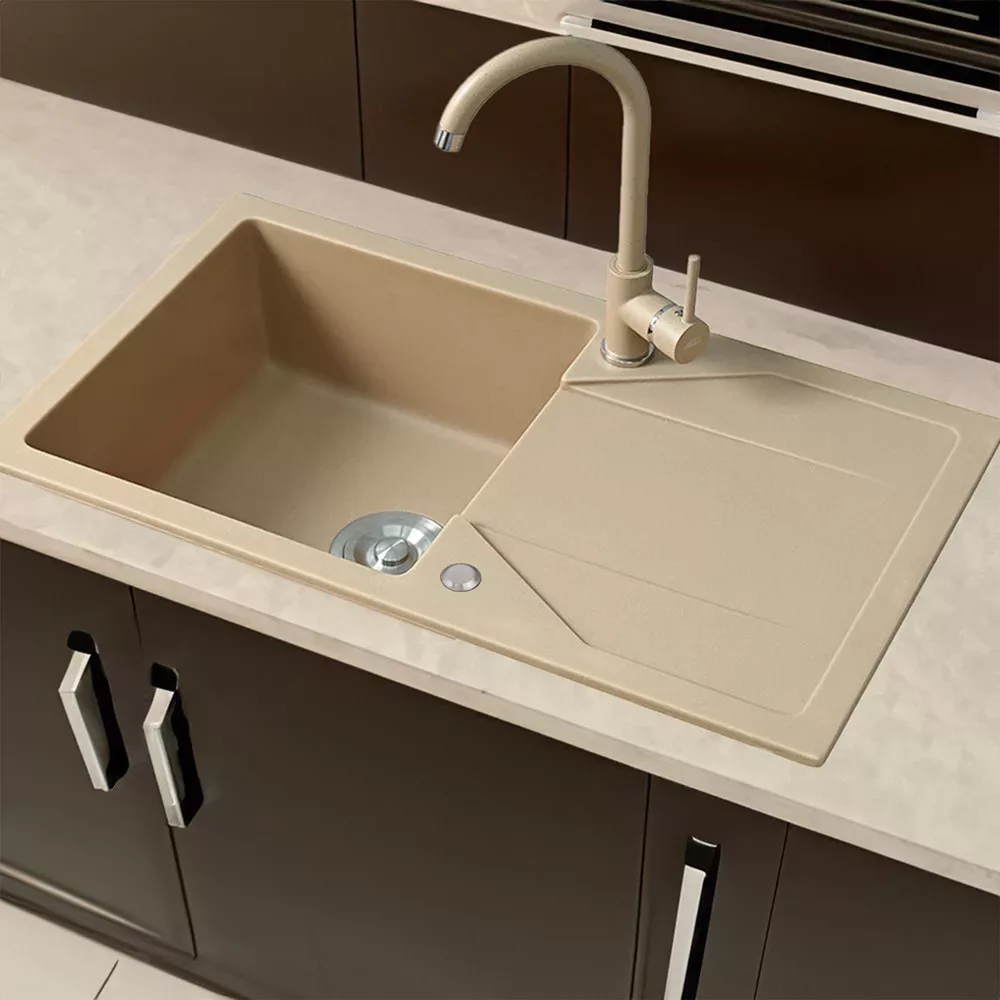 Bejž granitna sudopera uvijek daje vašoj kuhinji moderan i bezvremenski izgled. Širok raspon boja omogućuje vam da uskladite svoju kuhinjsku opremu i okruženje, bilo da je riječ o modernom ili klasičnom stilu.