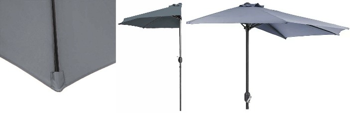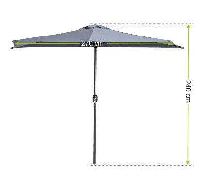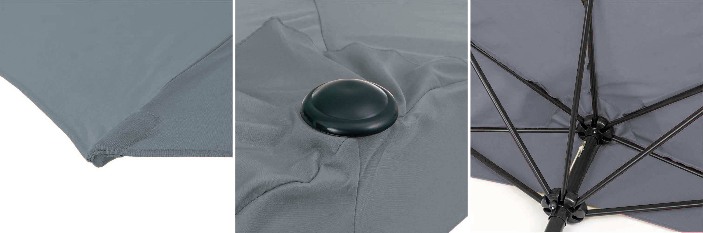 Stub ovog velikog vrtnog suncobrana izrađen je od čelika. Suncobran je polukružan, što mu omogućujeda zasjeni male prostore.Polukružna streha, ojačana konstrukcijom s 5 rebrastih lukova, omogućuje postavljanje suncobrana uz zid. Za izradu krovića korišten jepoliester. Odlikuje se niskom upojnošću vode. Zahvaljujući korištenim materijalima, veliki suncobran jeizdržljiv i jednostavan za rukovanje, što značajno utječe na njegov vijek trajanja.