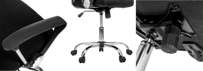 Uredska stolica ima široku bazu koja osiguravastabilnosttijekomkorištenja. Crna okretna stolica opremljena je najlonskim kotačićima koji štite pod od ogrebotina.Uredska stolicaimaTILTfunkciju, tj. zaključava vertikalnu poziciju i mehanizam nagiba.