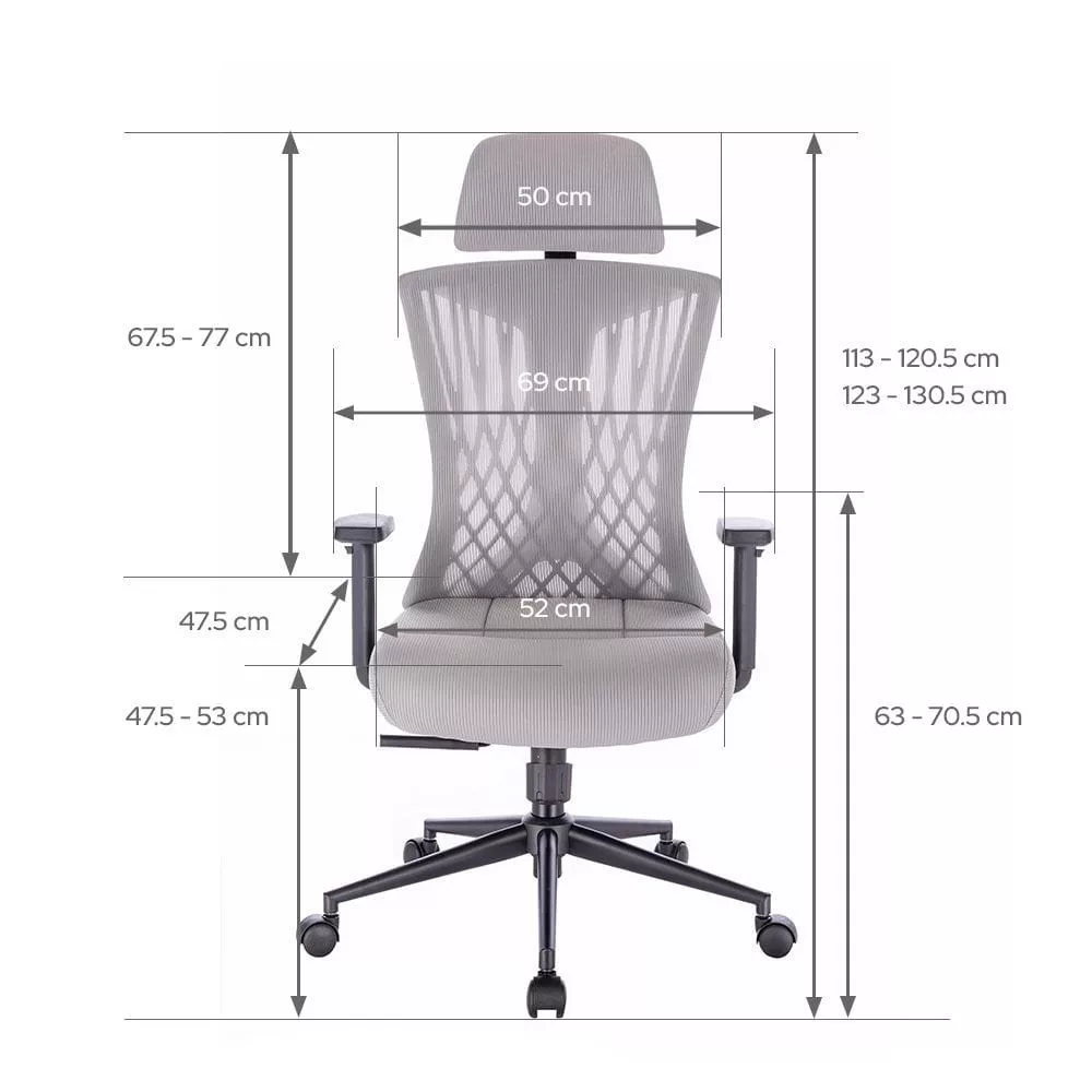 Uredska stolica nudi sveobuhvatne mogućnosti podešavanja koje omogućuju prilagodbu individualnim potrebama korisnika. Zahvaljujući plinskom amortizeru klase 3,visinu sjedala možete jednostavno prilagoditi visini stola, osiguravajući savršeno pristajanje. Osim toga, podesive naslonice za ruke i naslon za glavu omogućuju udobno podešavanje položaja ruku i glave. Ova moderna uredska stolica savršeno spaja elegantan dizajn s naprednim ergonomskim rješenjima, što je čini idealnim izborom za one koji cijene estetiku i iznimnu udobnost pri radu u uredu.